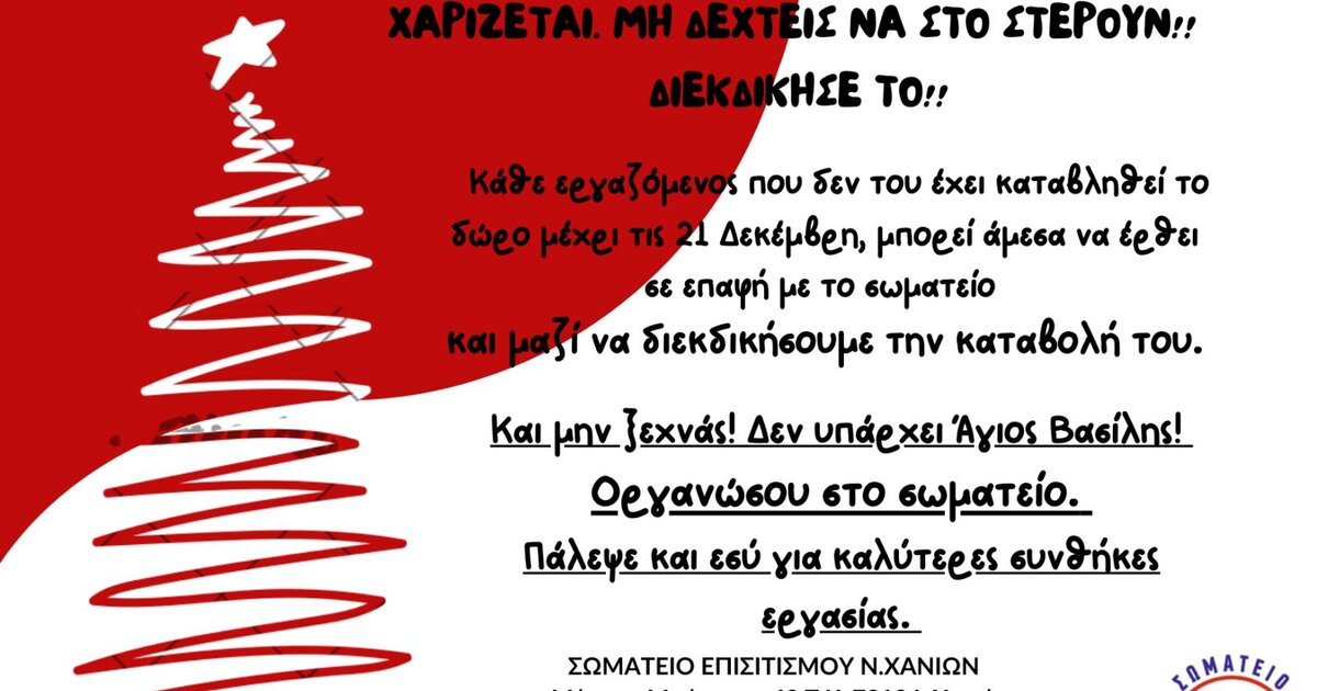 Ανακοίνωση- προτροπή στους εργαζόμενους για τη διεκδίκηση του Δώρου Χριστουγέννων εξέδωσε ο Σύνδεσμος Ιδιωτικού Προσωπικού Επιχειρήσεων Εκμεταλλεύσεως Εστιατορίων – Μαγειρείων Χανίων, αναφέροντας τους τρόπους υπολογισμού αλλά και τα δικαιώματα των εργαζόμενων, ζητώντας να καταγγείλουν περιστατικά που οι εργοδότες πράξουν διαφορετικά.