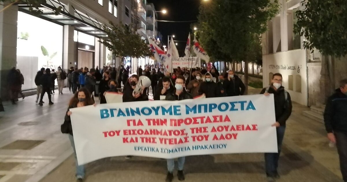 Με την ολοκλήρωση των ομιλιών το συλλαλητήριο σχημάτισε δυναμική πορεία μέσα από τους κεντρικούς δρόμους της πόλης πίσω από τα πανό των σωματείων, ώστε να ακουστούν ηχηρά τα συνθήματα του και το κάλεσμά του στους εργαζόμενους του Ηρακλείου για αγώνα".