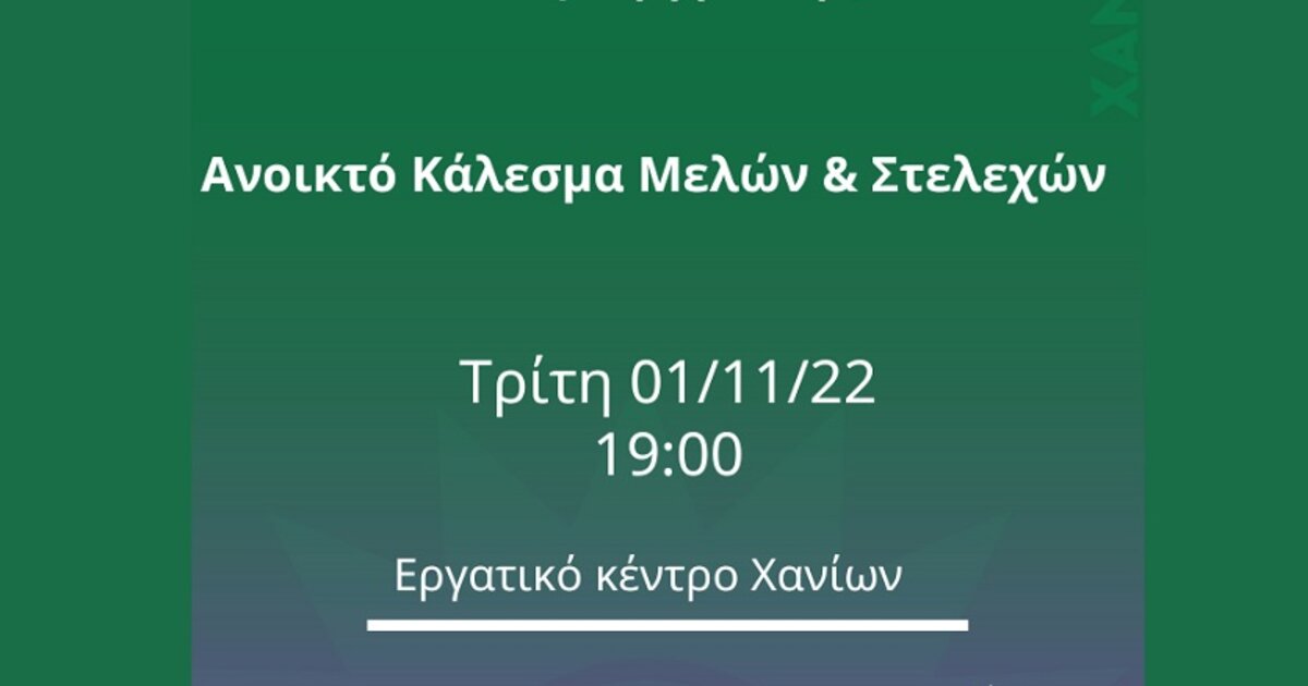 Η Νομαρχιακή Επιτροπή ΠΑΣΟΚ- Κινήματος Αλλαγής Χανίων απευθύνει ανοιχτό κάλεσμα στα μέλη και τα στελέχη του κινήματος, για συμμετοχή στη διευρυμένη συνεδρίαση της Νομαρχιακής Επιτροπής και των Τοπικών Οργανώσεων, την Τρίτη 1η Νοεμβρίου και ώρα 19:00 στο Εργατικό Κέντρο Χανίων.