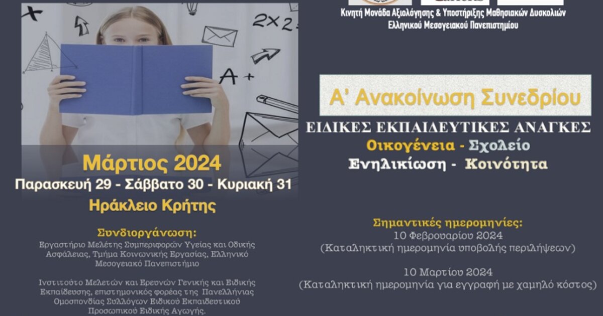 Στις 29, 30 και 31 Μαρτίου 2024, στο ξενοδοχείο Galaxy στο Ηράκλειο, θα διεξαχθεί το 2ο Πανελλήνιο Συνέδριο με θέμα «Ειδικές Εκπαιδευτικές Ανάγκες: οικογένεια- σχολείο – ενηλικίωση – κοινότητα».