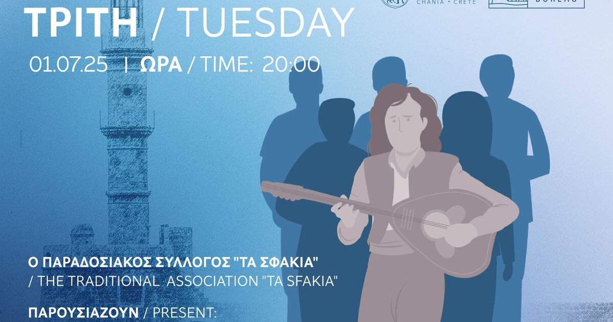 Αύριο, Τρίτη 01/07/2025, στις 20.00, ο Παραδοσιακός Σύλλογος Χανίων «ΤΑ ΣΦΑΚΙΑ» παρουσιάζει: «Η ΖΑΛΑ ΤΗΣ ΠΑΡΑΔΟΣΗΣ». Η Παραδοσιακή Στράτα θα ξεκινήσει από το Νεώριο Μόρο, με πρώτη στάση στο Γυαλί Τζαμί, στις 20.30, και τελικό σημείο συνάντησης την Πλατεία του Ι. Μ. Ν. Εισοδίων της Θεοτόκου (Μητρόπολη) Χανίων, στις 21.15.