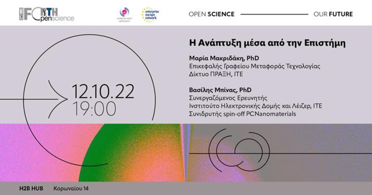 Θα μιλήσει η Δρ. Μαρία Μακριδάκη, επικεφαλής του Γραφείου Μεταφοράς Τεχνολογίας, Δίκτυο ΠΡΑΞΗ/ ΙΤΕ και ο Δρ. Βασίλης Μπίνας, Συνεργαζόμενος Ερευνητής του Ινστιτούτου Ηλεκτρονικής Δομής και Λέιζερ και Συνιδρυτής της spin off του ΙΤΕ, PCNanomaterials.