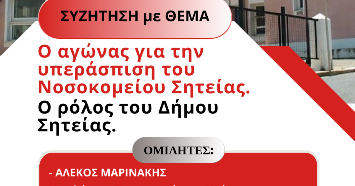 Η Λαϊκή Συσπείρωση Σητείας, με αφορμή την τραγική κατάσταση που βρίσκεται το νοσοκομείο Σητείας και τις αρνητικές εξελίξεις συνολικά στο Δημόσιο σύστημα υγείας, διοργανώνει ανοιχτή σύσκεψη-συζήτηση την Τρίτη 26 Σεπτέμβρη στις 6μμ, στη Κεντρική Πλατεία της Σητείας, με θέμα : «Ο αγώνας για την υπεράσπιση του Νοσοκομείου Σητείας – Ο ρόλος του Δήμου Σητείας».