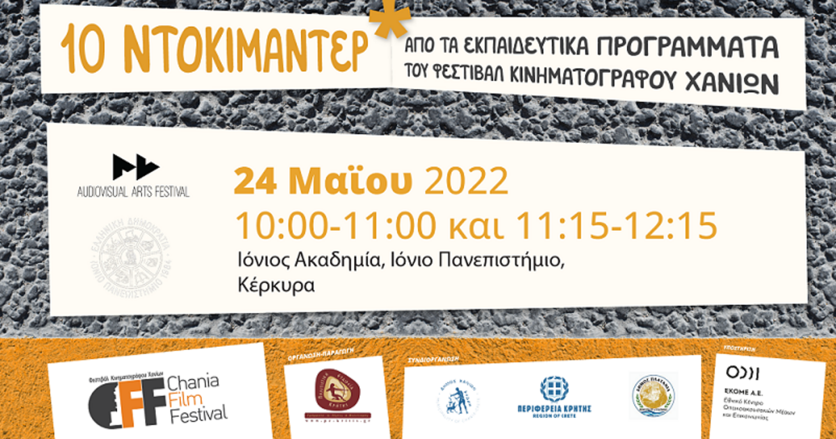 Το 15ο Φεστιβάλ Οπτικοακουστικών Τεχνών του Τμήματος Τεχνών, Ήχου και Εικόνας του Ιονίου Πανεπιστημίου, στο πλαίσιο της συνεργασίας με το Φεστιβάλ Κινηματογράφου Χανίων / Chania Film Festival (https://chaniafilmfestival.com) διοργανώνει την Τρίτη 24 Μαΐου 2022 συζήτηση με τίτλο «Το ντοκιμαντέρ στην εκπαίδευση».