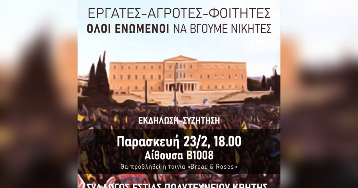 Ο Σύλλογος Οικότροφων Φοιτητών του Πολυτεχνείου Κρήτης απευθύνει κάλεσμα προς τα εργατικά σωματεία του νομού Χανίων σε εκδήλωση συζήτηση που θα πραγματοποιηθεί σήμερα Παρασκευή 23 Φεβρουαρίου, στις 18.00 στην Αίθουσα Β1008. Κατόπιν θα προβλημθεί η ταινία "Bread & Roses".