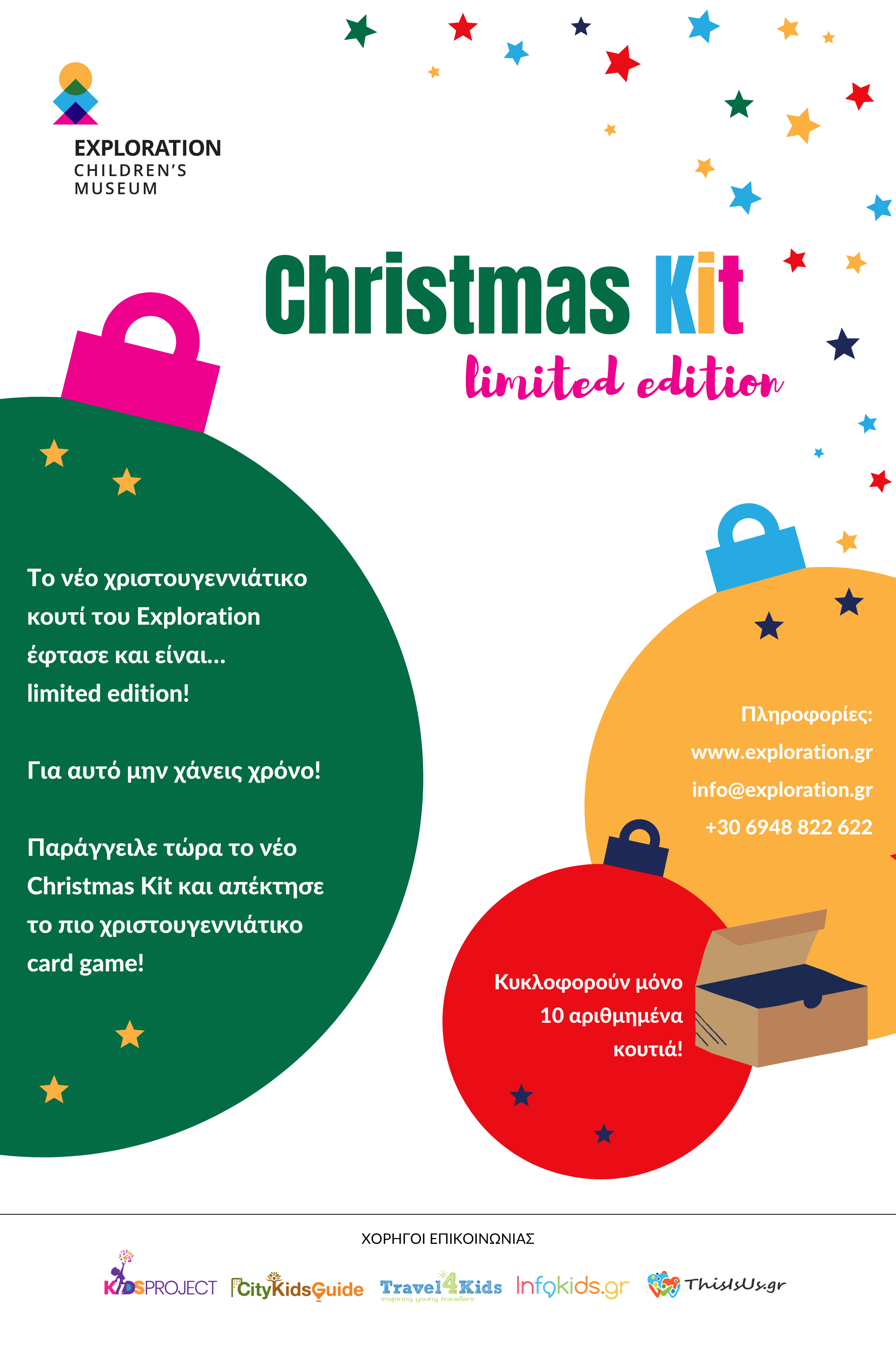 Το Christmas Kit – limited edition θα κυκλοφορήσει σε 10 αριθμημένα μοναδικά κουτιά που θα διατίθενται από σήμερα μέχρι και τις 15 Δεκεμβρίου. Τα κουτιά θα ταχυδρομηθούν στις 17 Δεκεμβρίου για να βρουν εγκαίρως την θέση τους κάτω από το δέντρο. Για αυτό μη χάνεις χρόνο! Παρήγγειλε τώρα το νέο Christmas Kit και ετοιμάσου για ένα μοναδικό οικογενειακό παιχνίδι την ημέρα των Χριστουγέννων!