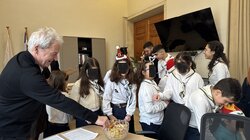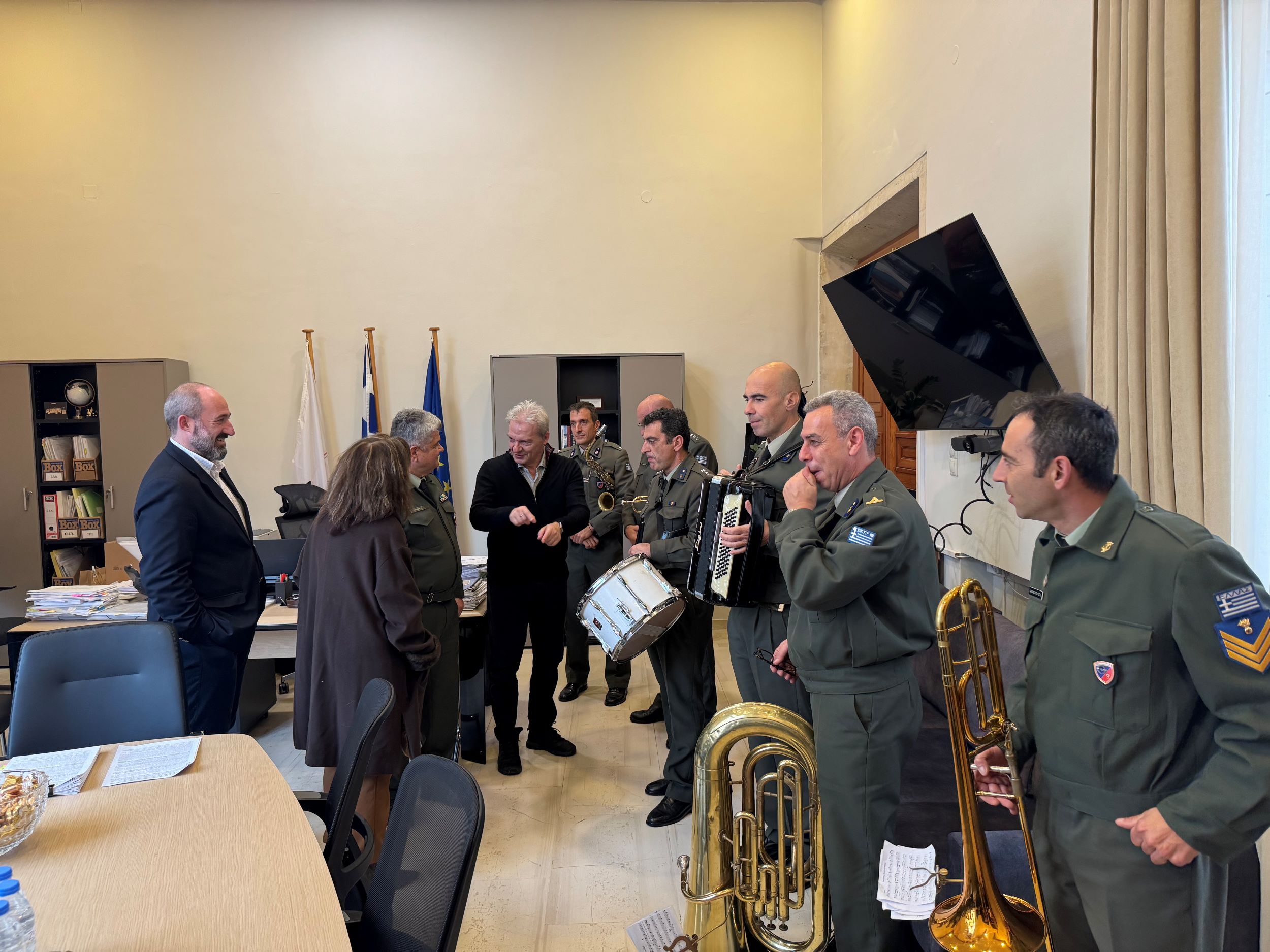 Με χαρούμενη εορταστική διάθεση, ο Δήμαρχος Ηρακλείου Αλέξης Καλοκαιρινός άκουσε τα χριστουγεννιάτικα κάλαντα από τους ανθρώπους του Μουσείου Παραδοσιακών Οργάνων Έρευνας & Τεκμηρίωσης «Θύραθεν», το Σώμα Ελλήνων Προσκόπων, τη Φιλαρμονική Ορχήστρα του Δήμου Ηρακλείου, το Σύλλογο Θρακιωτών Κρήτης, τους στρατιωτικούς μουσικούς της ΣΕΑΠ 44-ΣΔΙ και το Σύνολο Μικτών και Τοξοτών Οργάνων Κρήτης.