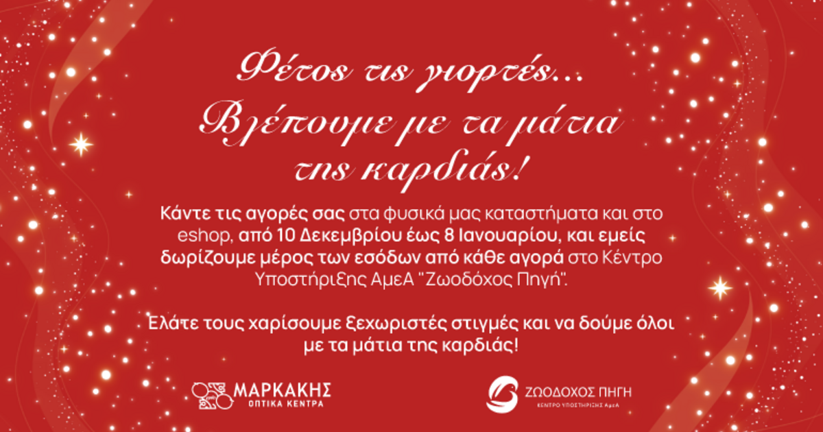 Τα Οπτικά Κέντρα Μαρκάκης για μία ακόμα χρονιά, αποδεικνύουν έμπρακτα την κοινωνική ευθύνη και το αίσθημα αλληλεγγύης, ανακοινώνοντας τη δωρεά μέρους των εσόδων τους από τις πωλήσεις κατά την εορταστική περίοδο στο Κέντρο Υποστήριξης ΑμεΑ “Ζωοδόχος Πηγή”.