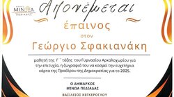 Tον μαθητή της Γ’ Γυμνασίου Αρκαλοχωρίου Γιώργο Σφακιανάκη, η ζωγραφιά του οποίου κόσμησε φέτος, την ευχετήρια κάρτα της Προέδρου της Δημοκρατίας Κατερίνας Σακελλαροπούλου, βράβευσε ο Δήμαρχος Μινώα Πεδιάδας Βασίλης Κεγκέρογλου. Ο Δήμαρχος συνεχάρη δημόσια τον μαθητή που έκανε τους πάντες υπερήφανους και υπογράμμισε ότι είναι σημαντικό και ελπιδοφόρο τα παιδιά να μη πτοούνται από τα προβλήματα και να μη το βάζουν κάτω.