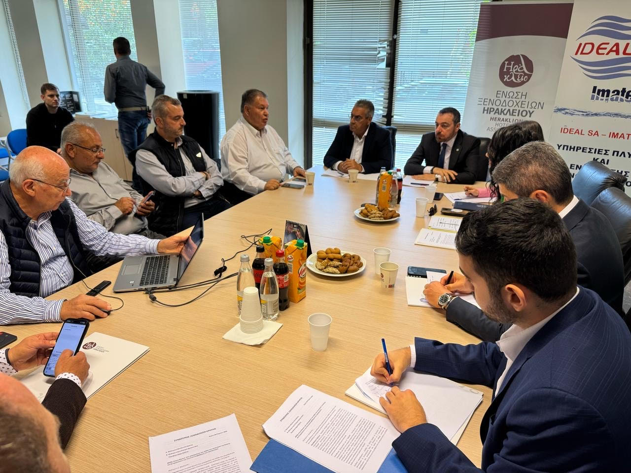 Βρεθήκαμε σήμερα, ύστερα από πρόσκληση των Προέδρων των Ενώσεων Ξενοδόχων της Κρήτης — του Νίκου Χαλκιαδάκη (Ηράκλειο), του Μανώλη Σταματάκη (Χανιά), του Μανώλη Τσακαλάκη (Ρέθυμνο) και του Γιάννη Κακουράκη (Σητεία) — στα γραφεία της Ένωσης Ξενοδοχείων Ηρακλείου, για μια κρίσιμη και ουσιαστική συζήτηση.