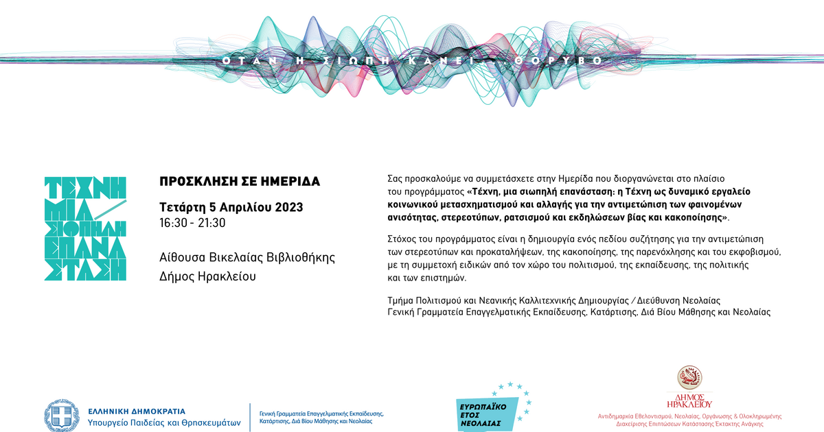 Το Υπουργείο Παιδείας και Θρησκευμάτων και ο Δήμος Ηρακλείου συμμετέχοντας στις δράσεις για το Ευρωπαϊκό Έτος Νεολαίας ανοίγουν τη συζήτηση για την αντιμετώπιση των στερεοτύπων και προκαταλήψεων, της κακοποίησης, της παρενόχλησης και του εκφοβισμού καθώς και την ευαισθητοποίηση των νέων μέσα από την Τέχνη.