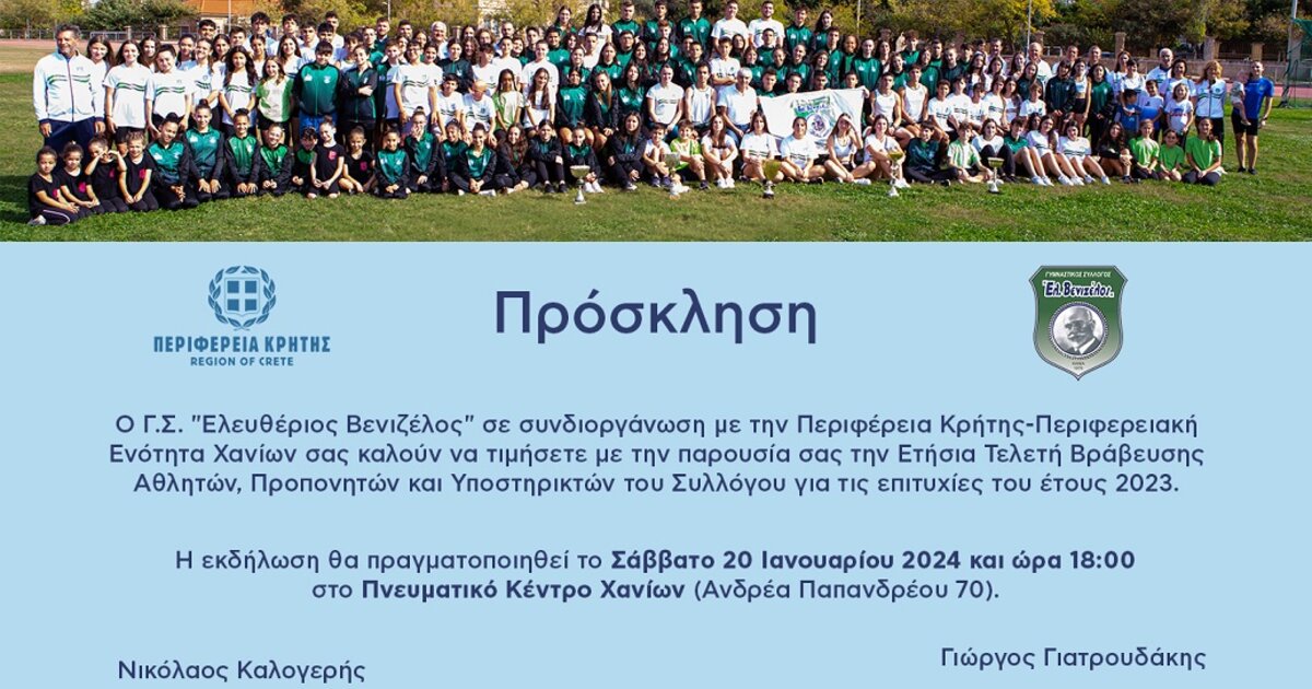 Την ετήσια τελετή βράβευσης αθλητών, προπονητών και υποστηρικτών του, διοργανώνει ο Γ.Σ. «Ελ. Βενιζέλος».
