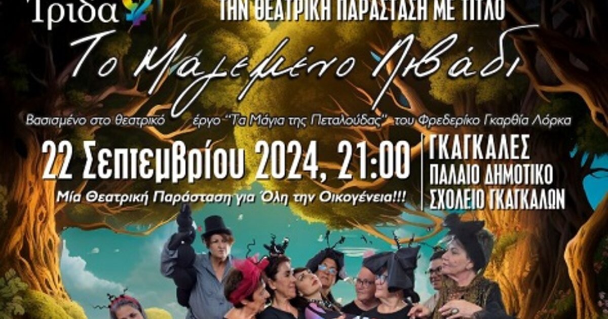 Ο Σύλλογος Γυναικών «ΊΡΙΔΑ» με την διοργάνωση της Περιφέρειας Κρήτης, και την υποστήριξη του Δήμου Ηρακλείου και του Πολιτιστικού Συλλόγου Γκαγκάλων στο πλαίσιο των Καλοκαιρινών Εκδηλώσεων, παρουσιάζει στις 20 Σεπτεμβρίου στις 21.00 στην Πύλη Βηθλεέμ και 22 Σεπτεμβρίου στις 21.00 στο παλιό δημοτικό σχολείο Γκαγκάλων, το Θεατρικό έργο με τίτλο: "Το Μαγεμένο Λιβάδι", μία Θεατρική παράσταση για όλη την οικογένεια με ελεύθερη είσοδο.