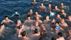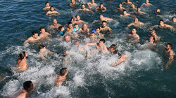 Δεκάδες οι κολυμβητές που έπεσαν στο νερό για να πιάσουν τον Σταυρό, μεταξύ αυτών και μια γυναίκα.