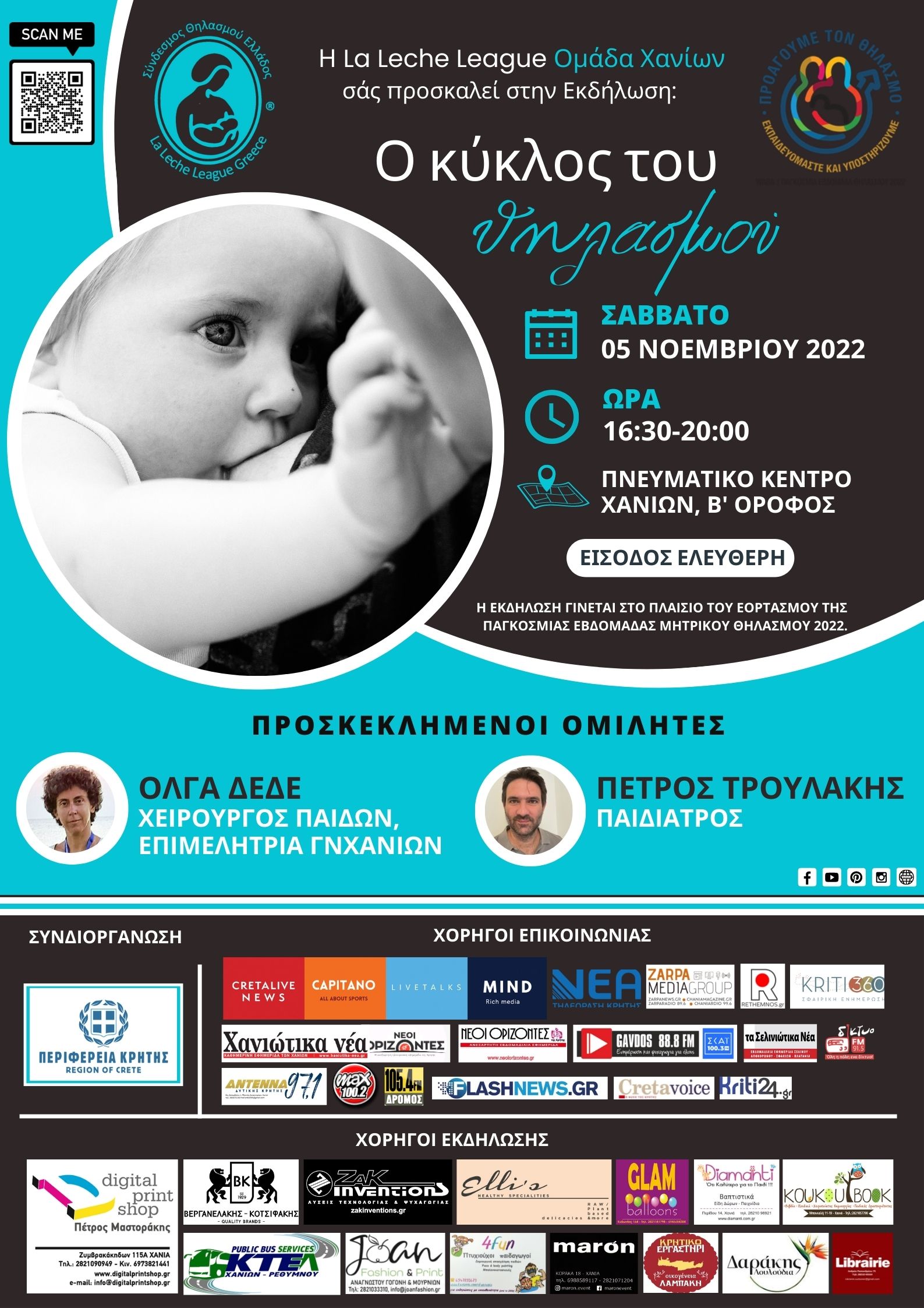 Στο πλαίσιο του εορτασμού της Παγκόσμιας Εβδομάδας Μητρικού Θηλασμού 2022, η οποία στη χώρα μας γιορτάζεται την πρώτη εβδομάδα του Νοεμβρίου (01-07 Νοεμβρίου), συνδιοργανώνει με την Περιφέρεια Κρήτης (Περιφερειακή Ενότητα Χανίων), Εκδήλωση Θηλασμού, με τίτλο «Ο κύκλος του θηλασμού», το Σάββατο 05 Νοεμβρίου 2022 και ώρα 16.30-20.00, στο Πνευματικό Κέντρο Χανίων, που βρίσκεται επί της οδού Ανδρέα Παπανδρέου 74, στα Χανιά.