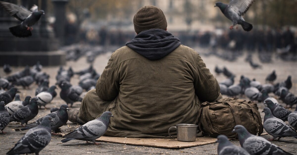 Θλιβερή εικόνα στο κέντρο του Ηρακλείου: Άστεγος και περιστέρια τρώνε ένα κομμάτι ψωμί...