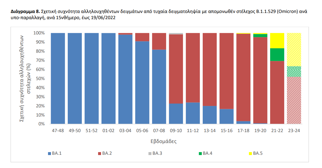 Η διαχρονική εξέλιξη της σχετικής συχνότητας των αλληλουχηθέντων δειγμάτων από τυχαία δειγματοληψία (Ν=50.910) ανά είδος στελεχών, μέχρι και την εβδομάδα 22 του 2022 απεικονίζεται στο Διάγραμμα 8, ενώ δίνονται επιπλέον προσωρινά στοιχεία για τις εβδομάδες 23-24. Στο Διάγραμμα 9 απεικονίζεται η διαχρονική εξέλιξη της σχετικής συχνότητας εμφάνισης των υπο-παραλλαγών του στελέχους Omicron. Κατά τη διάρκεια του διμήνου πριν τις 11 Ιουνίου 2022, οι δύο πιο συχνές υπο-παραλλαγές του στελέχους Omicron που απομονώθηκαν από εγχώρια δείγματα από τυχαία δειγματοληψία ήταν το BA.2 με ποσοστό 85,2%, ακολουθούμενο από το BA.1 με ποσοστό 5,6%.