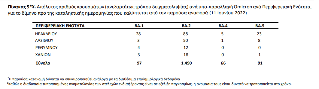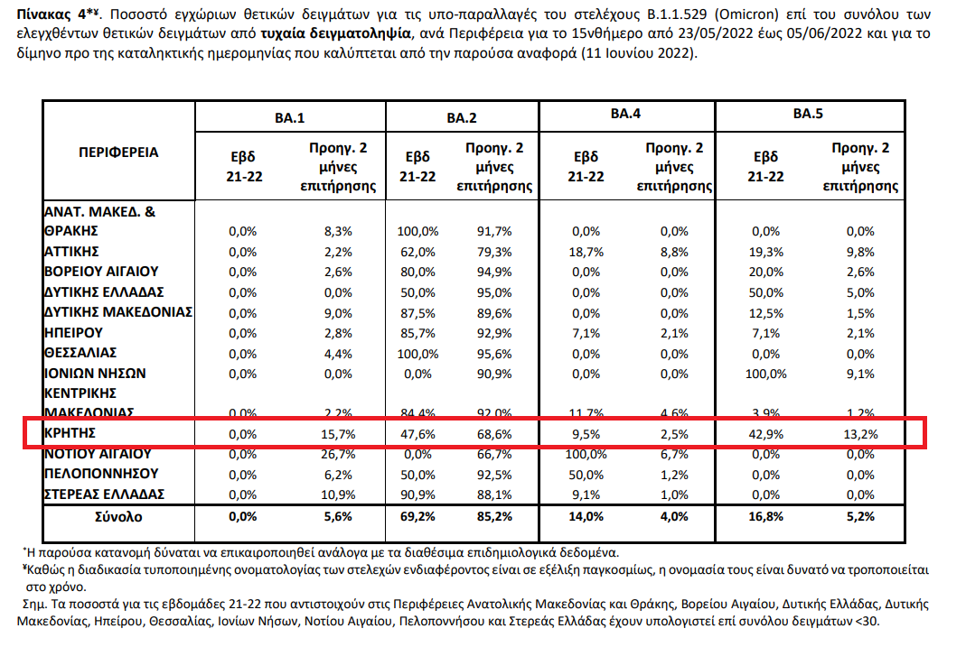 Σημ.1 Στα “Λοιπά Στελέχη Πιθανού Ενδιαφέροντος” περιλαμβάνονται όλα τα στελέχη του πίνακα 3 εκτός των Β.1.1.7 (Alpha), B.1.1.318 (Variant E484K), B.1.351/501Y.V2 (Beta), B.1.617.2 (Delta) και Β.1.1.529 (Omicron). Σημ.2 Στα “Άλλα Κυκλοφορούντα Στελέχη” περιλαμβάνονται τα παλαιότερα στελέχη που κυκλοφορούσαν κατά την πρώτη και δεύτερη περίοδο της πανδημίας και τα οποία δεν φέρουν μεταλλάξεις που σχετίζονται με αυξημένη μεταδοτικότητα ή μολυσματικότητα ή διαφυγή ανοσίας ή διαγνωστικά ζητήματα (π.χ. del 69-70, N501Y, E484K, L452R).