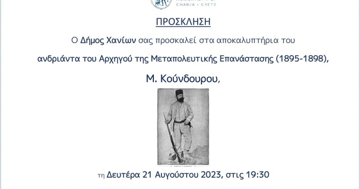 Τα αποκαλυπτήρια του ανδριάντα του Αρχηγού της Μεταπολιτευτικής Επανάστασης (1895 – 1898), Μανούσου Κούνδουρου, θα πραγματοποιηθούν από τον Δήμο Χανίων τη Δευτέρα 21 Αυγούστου 2023, στις 19.30, στον αύλειο χώρο της Οικίας (Βίλα) Κούνδουρου (Ηρ. Πολυτεχνείου 2).
