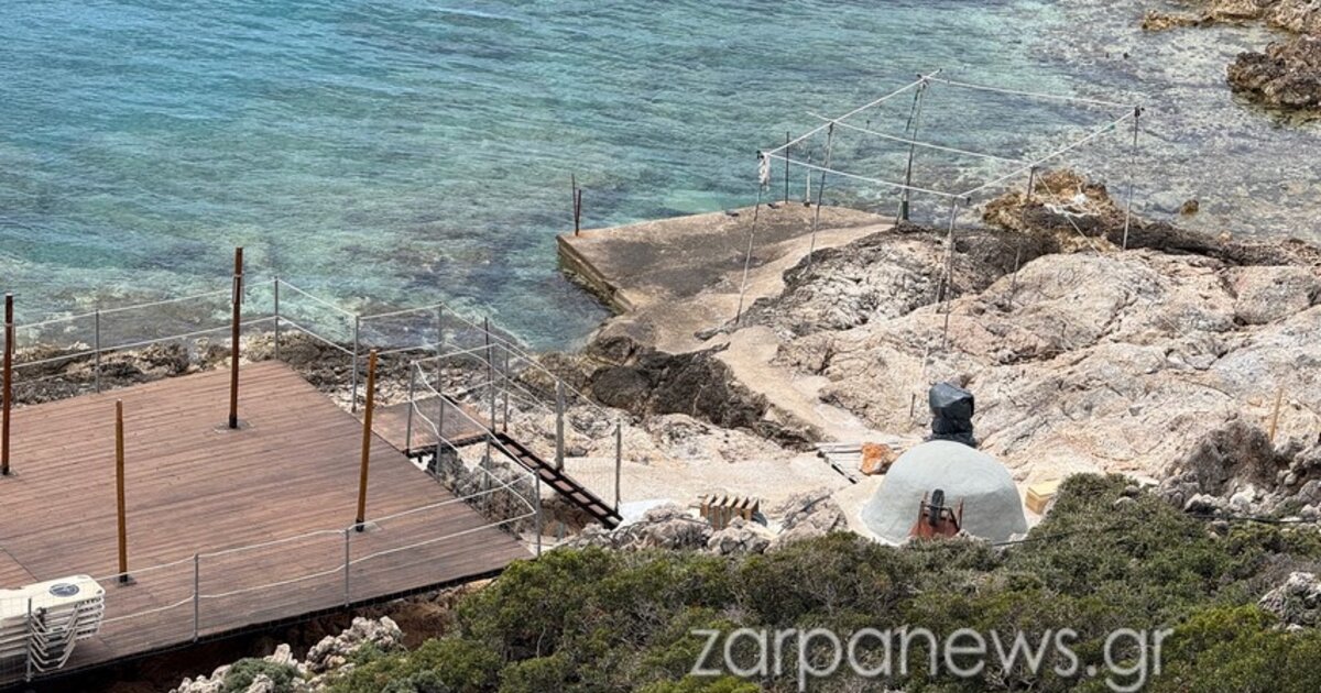 Μια μεταλλική εξέδρα έχει «ξεφυτρώσει» πάνω στα βράχια, σε μια από τις πιο αγνές περιοχές του νομού Χανίων, στο δυτικό τμήμα της χερσονήσου Ροδωπού. Μάλιστα, όπως γράφει το zarpanews.gr στο σημείο, έχουν τοποθετηθεί υποδομές για ομπρελοκαθίσματα, για ντουζ αλλά και υποδομή για μπαρ!