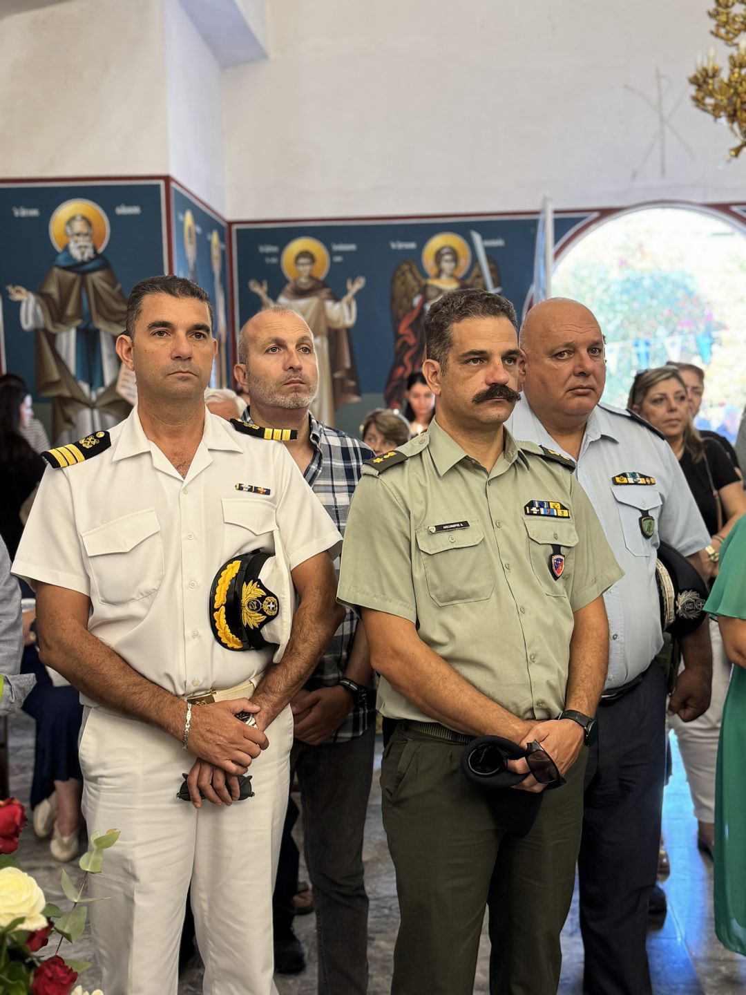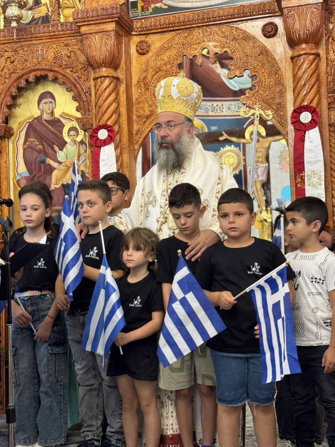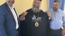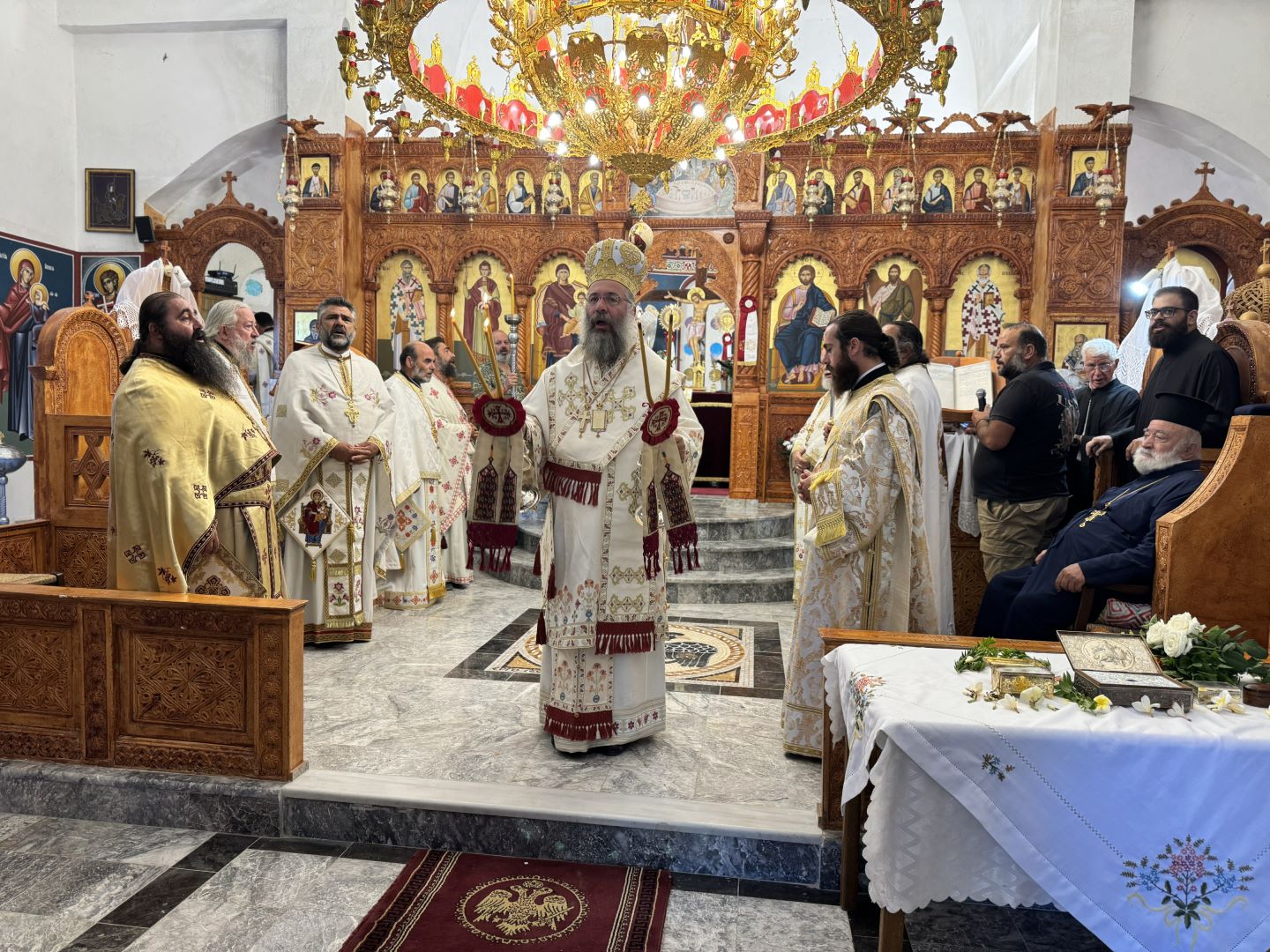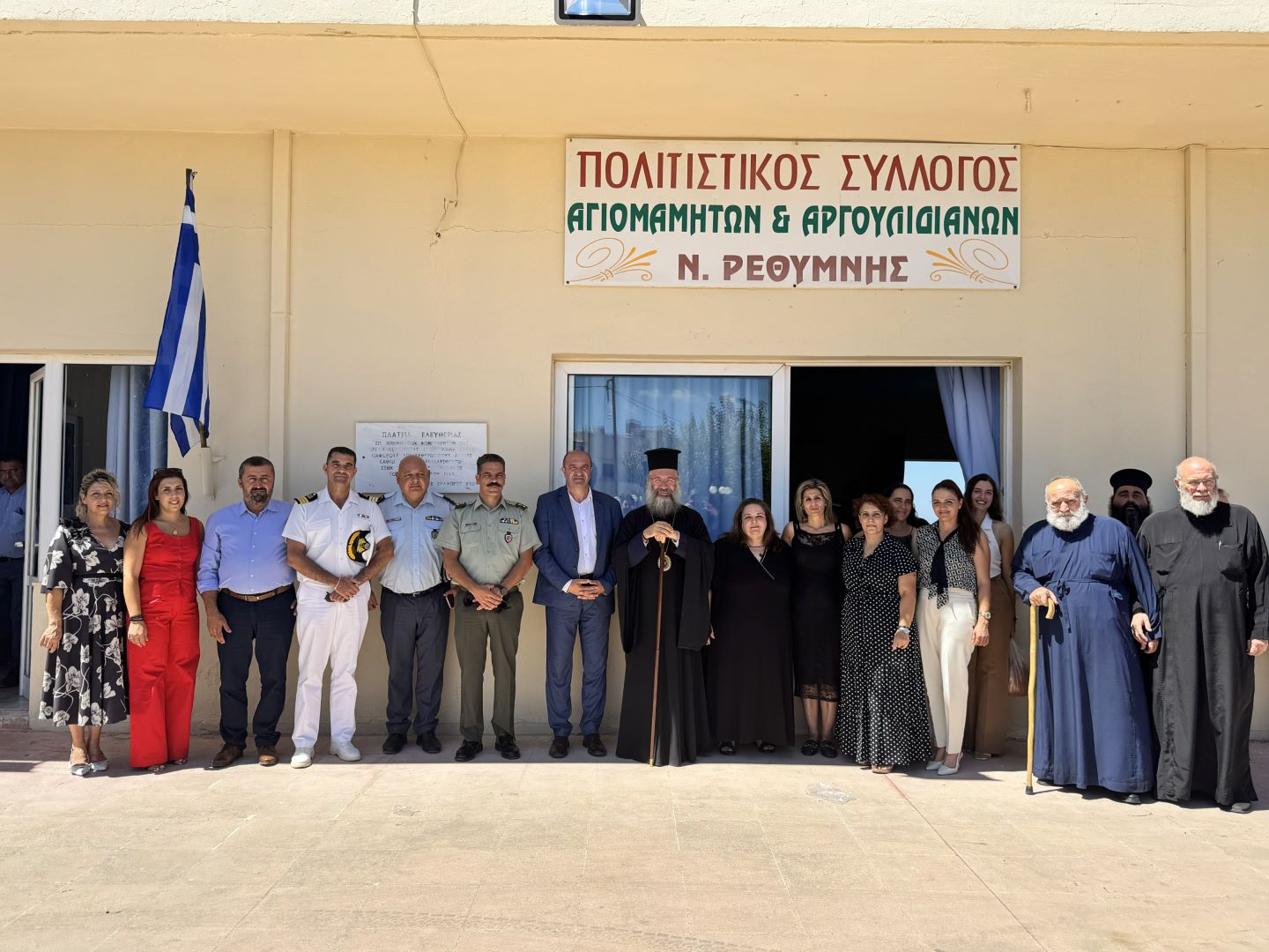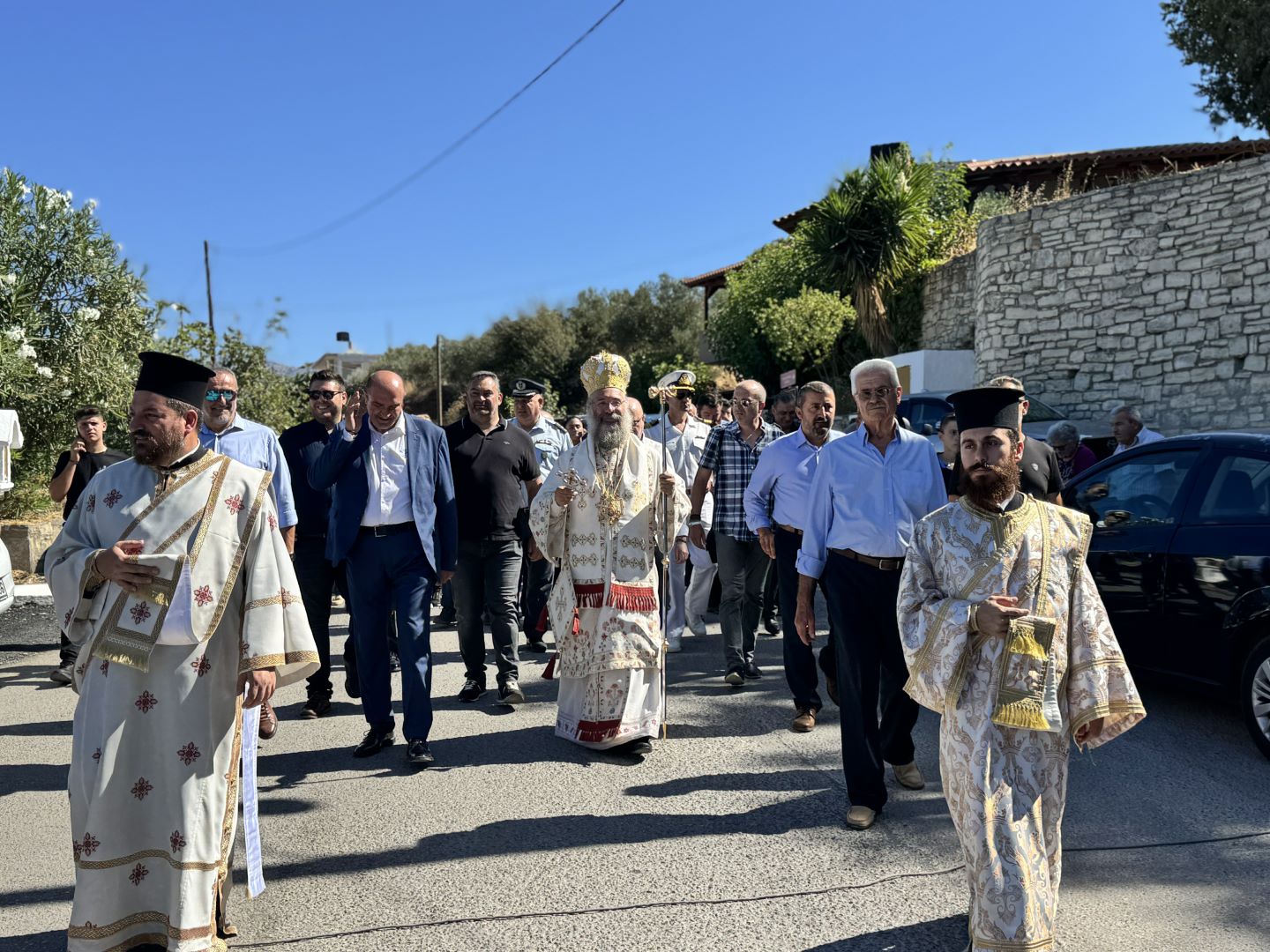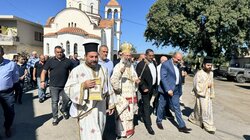 Προ της απολύσεως της Θείας Λειτουργίας, τον Σεβασμιώτατο προσφώνησε και καλωσόρισε με θερμούς λόγους ο Εντεταλμένος Περιφερειακός Σύμβουλος Πολιτικής Προστασίας της Περιφέρειας Κρήτης κ. Μιχαήλ Σαρρής, ο οποίος, μαζί με τον Εφημέριο της Ενορίας, προσέφεραν στο Σεβασμιώτατο Ιερό Εγκόλπιο και καλάθι με παραδοσιακά προϊόντα.