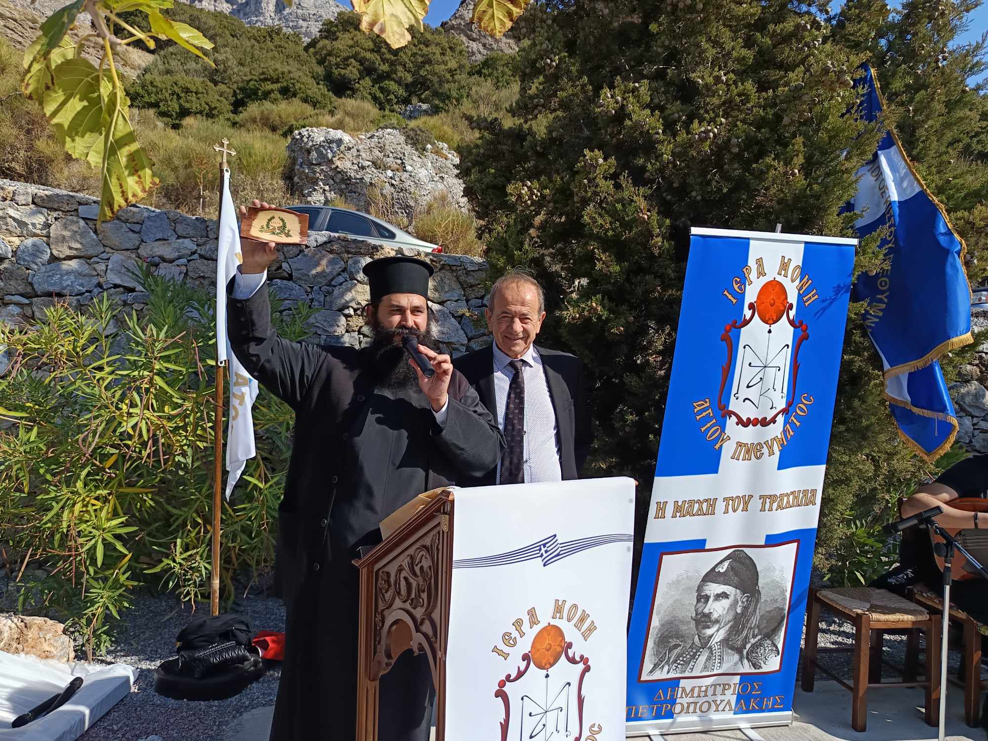 Ο ηγούμενος της Μονής Πανοσιολογιότατος Αρχιμανδρίτης Βαρθολομαίος Ξερουδάκης και ο Δήμαρχος Αγίου Βασιλείου Γιάννης Ταταράκης υποδέχτηκαν τον Δήμαρχο Ανατολικής Μάνης κ.Πέτρο Ανδρεάκο και την πολυμελή αντιπροσωπεία Μανιατών προκειμένου να τιμήσουν του ήρωες σε μια πολύ ξεχωριστή εκδήλωση.