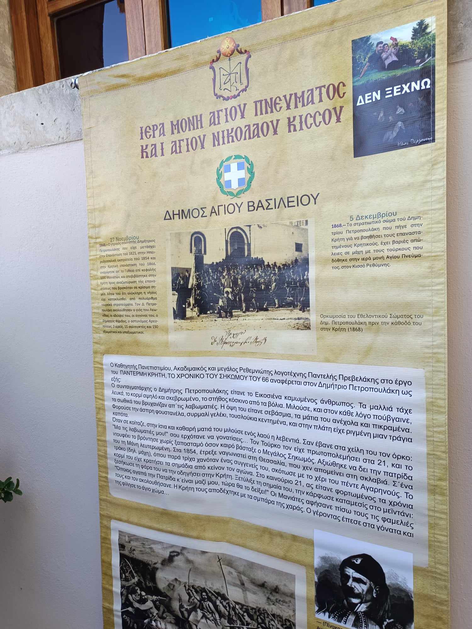 Εκδήλωση τιμής και μνήμης πραγματοποιήθηκε το Σάββατο 2 Νοεμβρίου 2024 στην Ιερά Μονή Αγίου Πνεύματος στον Κισσό του Δήμου Αγίου Βασιλείου, με αφορμή τη συμπλήρωση 156 χρόνων από τη δεύτερη μεγάλη κάθοδο στρατιωτικού σώματος 1.000 Μανιατών αγωνιστών στην Κρήτη, υπό τον οπλαρχηγό Δημήτριο Πετροπουλάκη, προς ενίσχυση του απελευθερωτικού αγώνα κατά του οθωμανικού ζυγού. Η μάχη που έγινε πέριξ της Μονής του Αγίου Πνεύματος στη θέση «Τράχηλας» το 1868 άφησε πίσω 200 νεκρούς αγωνιστές και μαρτυρείται ως η πλέον πολύνεκρη αναμέτρηση Ελλήνων και Τούρκων, μετά από την Εθελοθυσία του Αρκαδίου.
