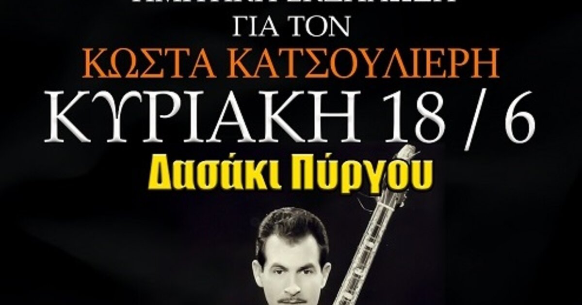 Ο Πολιτιστικός Μορφωτικός Σύλλογος Πύργου σε συνεργασία με την Περιφέρεια Κρήτης διοργανώνει την Κυριακή 18/06/2023 στο Δασάκι Πύργου Μονοφατσίου, τιμητική εκδήλωση στον Κωνσταντίνο Κατσουλιέρη για το έργο που άφησε στην κρητική μουσική.