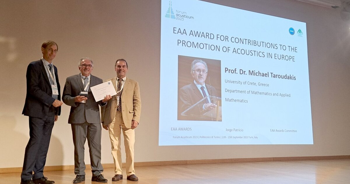 Στον συνεργαζόμενο ερευνητή του Ινστιτούτου Υπολογιστικών Μαθηματικών του Ιδρύματος Τεχνολογίας και Έρευνας (ΙΤΕ), και καθηγητή του Τμήματος Μαθηματικών και Εφαρμοσμένων Μαθηματικών του Πανεπιστημίου Κρήτης, Μιχάλη Ταρουδάκη, απονεμήθηκε το Διεθνές Βραβείο “EAA award for contributions to the promotion of Acoustics in Europe” από την Ευρωπαϊκή Ένωση Ακουστικής (European Acoustics Association-ΕΑΑ), www.euracoustics.org κατά τη διάρκεια του Συνεδρίου «FORUM ACUSTICUM 2023» που πραγματοποιείται στο Τορίνο, 11-15 Σεπτεμβρίου 2023. Το βραβείο απονέμεται από την ΕΑΑ, ανά τριετία, σε πρόσωπο ή φορέα που με τη δράση του έχει συμβάλει στην ανάπτυξη του ενδιαφέροντος για την ακουστική επιστήμη στην Ευρώπη.