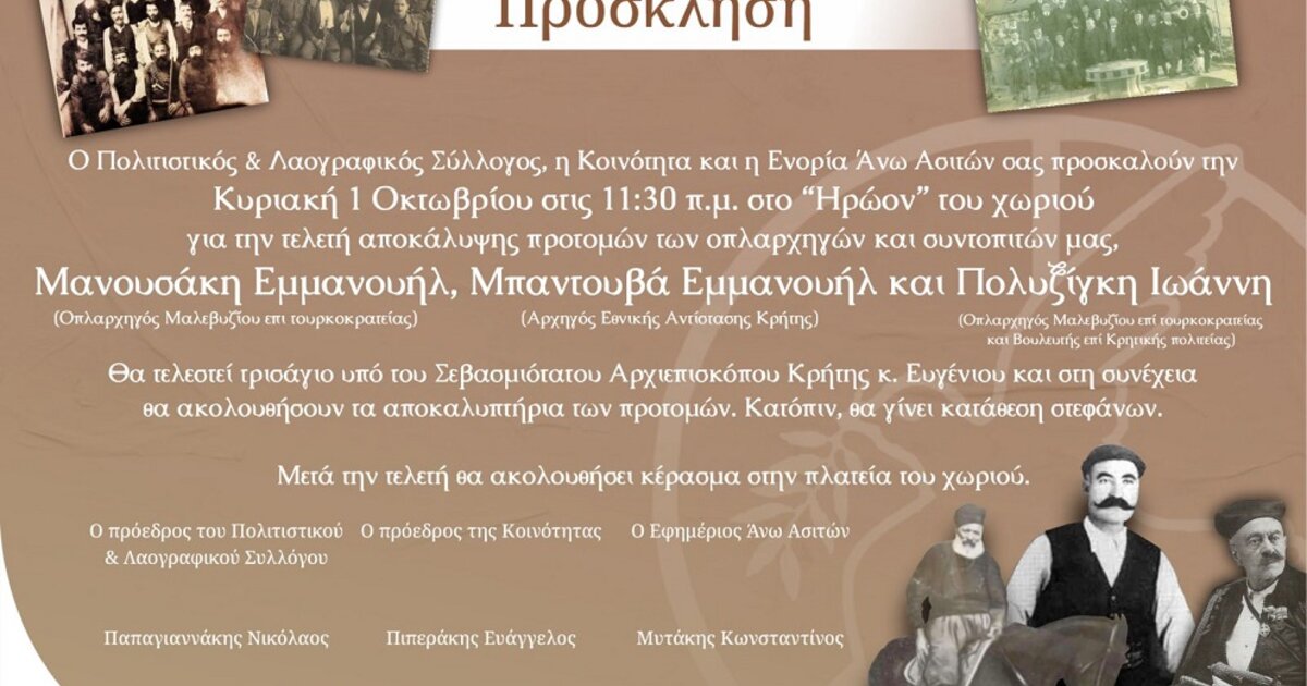 Το Διοικητικό Συμβούλιο και τα μέλη του «Πολιτιστικού και Λαογραφικού Συλλόγου Άνω Ασιτών» διοργανώνει τα Αποκαλυπτήρια των Προτομών του Καπετάν Γιάννη Πολυξίγκη, που έπαιξε σημαντικό ρόλο στον αγώνα για την ένωση της Κρήτης με την Ελλάδα.