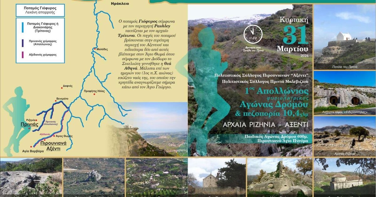 Ο Πολιτιστικός Σύλλογος Πιρουνιανών «Αξέντι» και ο Πολιτιστικός Σύλλογος Πρινιά, με την υποστήριξη του Δήμου Γόρτυνας, της Περιφέρειας Κρήτης και του Συλλόγου Μαραθωνοδρόμων Κρήτης, διοργανώνουν τον 1ο Απολλώνιο Φυσιολατρικό Αγώνα Δρόμου & Πεζοπορίας 10,4 χλμ., από την Αρχαία Ριζηνία ως το Αξέντι, την Κυριακή 31 Μαρτίου 2024 και ώρα 11:00. Με αφετηρία τον Άγιο Παντελεήμονα Πρινιά (Πατέλα του Πρινιά) και τερματισμό στο Άγιο Πνεύμα, Αξέντι, Πιρουνιανά Αγίας Βαρβάρας, οι δρομείς και πεζοπόροι θα διανύσουν απόσταση 10,4 χλμ. σε μια ιστορική διαδρομή, σπάνιας φυσικής ομορφιάς, ακολουθώντας τα μονοπάτια της Αθηνάς και του Τρίτωνα.