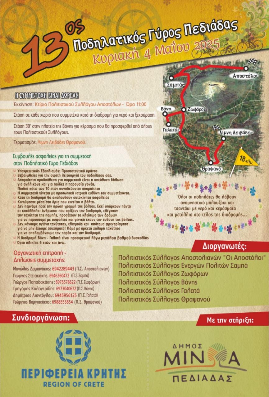 Στις 4 Μαΐου 2025, ημέρα Κυριακή και ώρα 11:00 θα πραγματοποιηθεί ο Ποδηλατικός Γύρος Πεδιάδος, για 13η χρονιά όπως έχει καθιερωθεί.