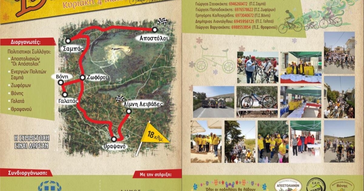 Με αφετηρία τους Αποστόλους οι ποδηλάτες διασχίζουν τα χωριά Σαμπά, Ζωφόρους, Βόνη, Γαλατά, Θραψανό και καταλήγουν στην περιοχή της λίμνης των Λειβάδων σε μια αξέχαστη βόλτα ,στην ανοιξιάτικη φύση , σε μια όμορφη διαδρομή.