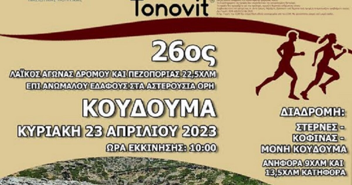 Αντίστροφη μέτρηση για τον 26ο Αγώνα Ανώμαλου Δρόμου και Πεζοπορίας Κουδουμά, που θα διεξαχθεί την Κυριακή 23 Απριλίου 2023 (ώρα εκκίνησης: 10:00), δίνοντας την ευκαιρία σε δρομείς και πεζοπόρους από κάθε γωνιά της χώρας και από το εξωτερικό να… δοκιμάσουν τις δυνάμεις τους σε μια ορεινή διαδρομή 22,5 χιλιομέτρων, σε ένα φυσικό τοπίο μοναδικής ομορφιάς.