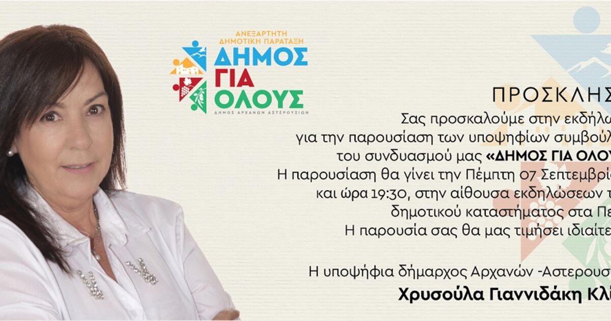 Τους υποψήφιους του συνδυασμού της "Δήμος για όλους" παρουσιάζει την Πέμπτη 7 Σεπτεμβρίου η υποψήφια δήμαρχος Αρχανών - Αστερουσίων Χρυσούλα Γιαννιδάκη Κλίνη στην αίθουσα εκδηλώσεων του Δημοτικού Καταστήματος στα Πεζά.