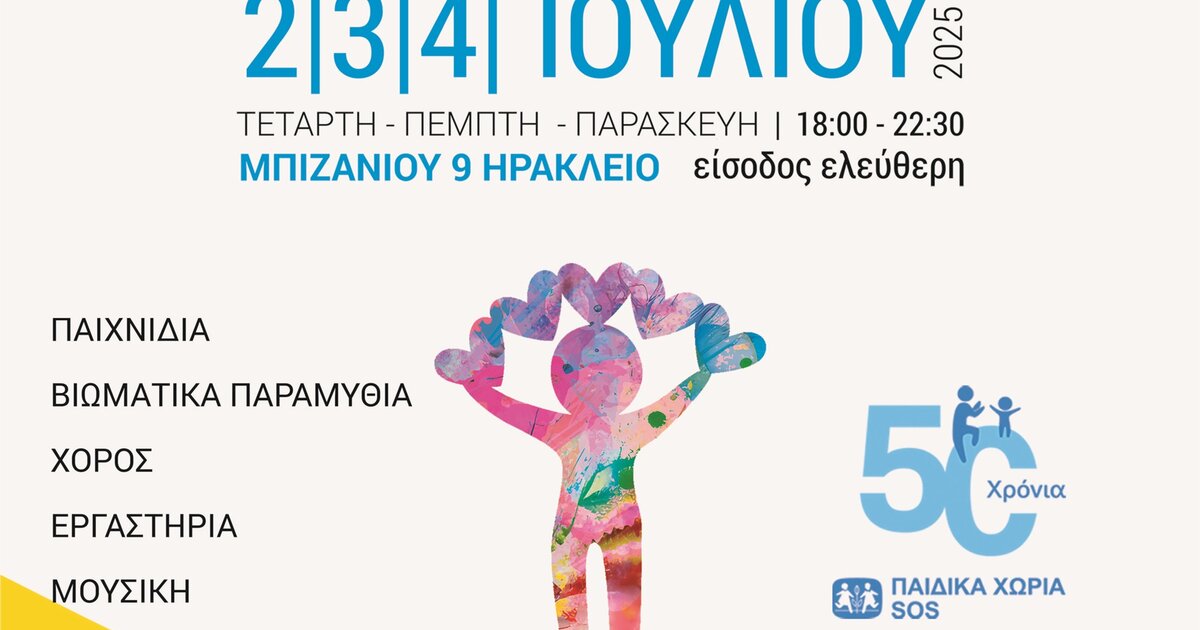 Η «Ομάδα Δράσης 17», μια ερασιτεχνική ομάδα με 17 χρόνια ενεργής εθελοντικής δράσης, διοργανώνει τριήμερο εκδηλώσεων με τίτλο «ΣΥΝΕΧΙΖΩ & ΣΤΗΡΙΖΩ», από την Τετάρτη 2 έως και την Παρασκευή 4 Ιουλίου 2025 και ώρες 17.00-23.00 στον φιλόξενο προαύλιο χώρο του Κέντρου Στήριξης Παιδιού και Οικογένειας των Παιδικών Χωριών SOS Ελλάδος (οδός Μπιζανίου 9, Ηράκλειο) καθώς και στον ευρύτερο χώρο της πλατείας.