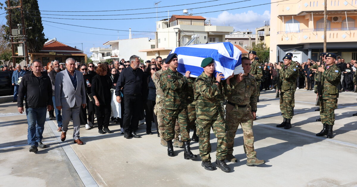 Το φέρετρο του νεαρού έφτασε στον Ιερό Ναό του Αγίου Τίτου, όπου τελέστηκε η κηδεία του, τυλιγμένο με τη γαλανόλευκη σημαία.