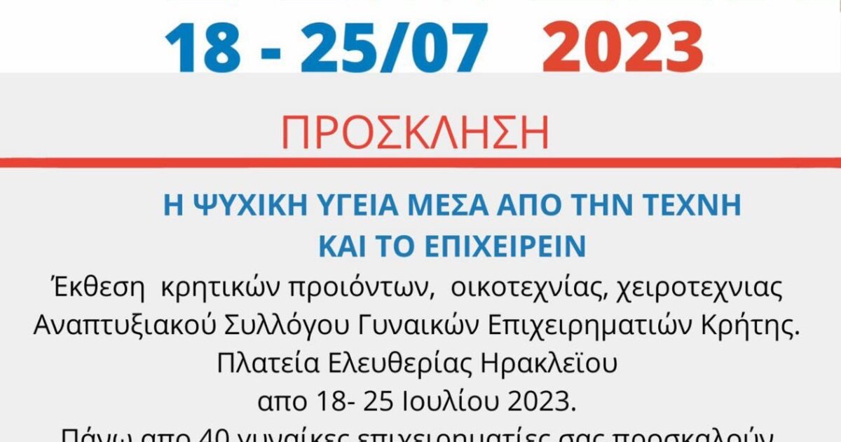 Όπως κάθε χρόνο έτσι και φέτος ο Αναπτυξιακός Σύλλογος Γυναικών Επιχειρηματιών Κρήτης (Α.Σ.Γ.Ε.Κ.) διοργανώνει την ετήσια Έκθεση – Θεσμό με τίτλο «Ψυχική Υγεία μέσω της Τέχνης και του Επιχειρείν» Η έκθεση θα πραγματοποιηθεί στην Πλατεία Ελευθερίας στο κέντρο του Ηρακλείου 18 – 25 Ιουλίου 2023 σε συν-διοργάνωση με την Περιφέρεια Κρήτης.