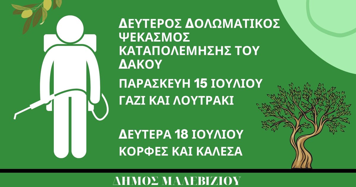 Αύριο Παρασκευή 15 Ιουλίου ξεκινά ο δεύτερος δολωματικός ψεκασμός για την καταπολέμηση του δάκου σε περιοχές του Δήμου Μαλεβιζίου, στο πλαίσιο του προγράμματος δακοκτονίας της Περιφερειακής Ενότητας Ηρακλείου.