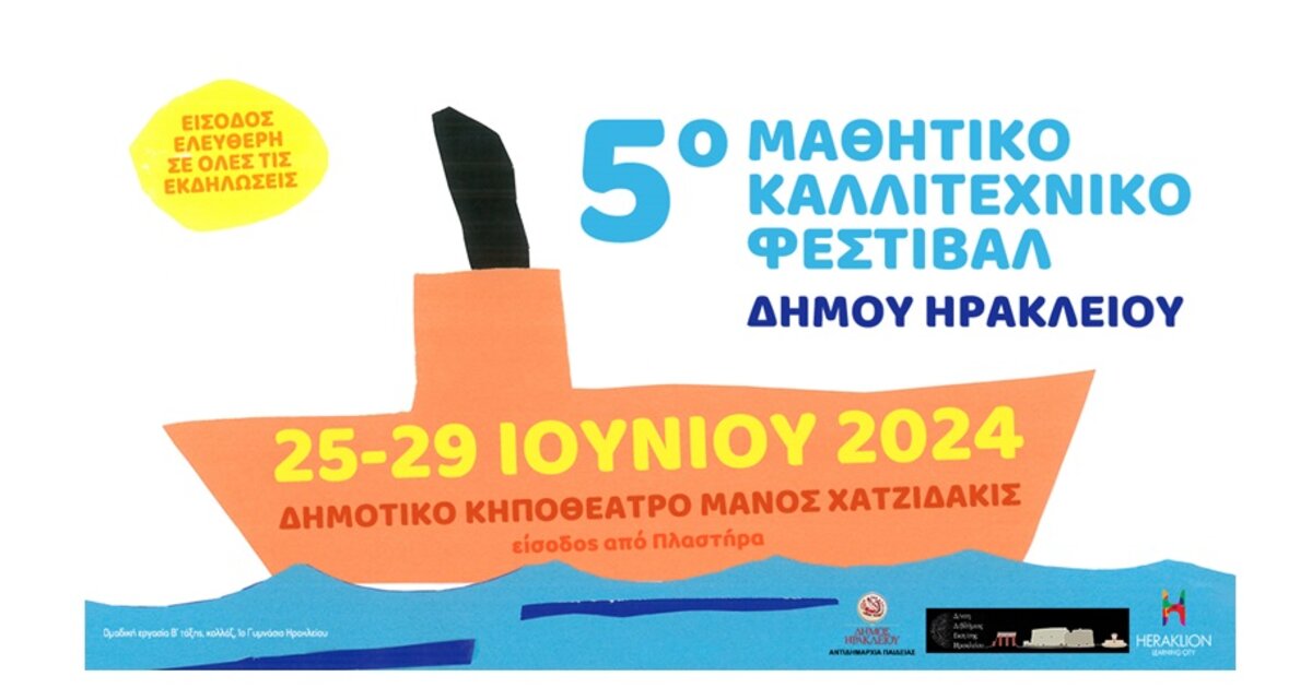Στις 25 Ιουνίου ξεκινά το 5ο Μαθητικό Καλλιτεχνικό Φεστιβάλ το οποίο διοργανώνει ο Δήμος Ηρακλείου δια της Αντιδημαρχίας Παιδείας, σε συνεργασία με τη Διεύθυνση Δευτεροβάθμιας Εκπαίδευσης Ηρακλείου.