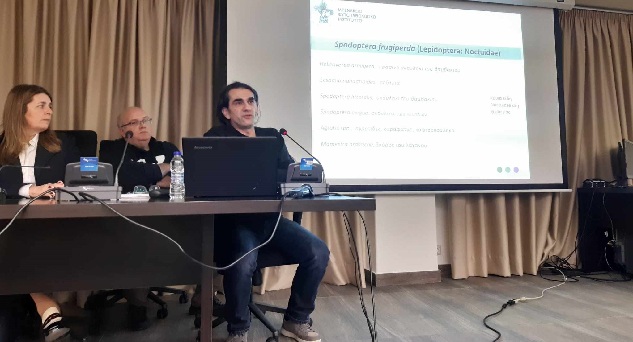 Εισηγήσεις παρουσίασαν οι: Δρ. Δημήτριος Παπαχρήστος Ερευνητής Α΄ της επιστημονικής Διέυθυνσης Εντομολογίας και Γεωργικής Ζωολογίας του Μπενάκειου Φυτοπαθολογικού Ινστιτούτου, με τίτλο : «Το έντομο Spodoptera frugiperda και η εμφάνισή του σε περιοχές της Κρήτης»,κ. Χρήστος Αραμπατζής, Γεωπόνος MSc, Προϊστάμενος του τμήματος Φυτοϋγεινομικού Ελέγχου του Υπουργείου Αγροτικής Ανάπτυξης και Τροφίμων, με τίτλο : « Φυτοϋγειονομικά μέτρα για τον επιβλαβή οργανισμό Spodoptera frugiperda στα πλαίσια των κανονισμών της ΕΕ 2016/2031 και 2023/1134» , και ο Δρ. Εμμανουήλ Ροδιτάκης, Αναπληρωτής Καθηγητής Γεωργικής Εντομολογίας και Φαρμακολογίας, Πρόεδρος Τμήματος Γεωπονίας, Σχολή Γεωπονικών Επιστημών, ΕΛΜΕΠΑ, με τίτλο : « Η αντιμετώπιση των λεπιδόπτερων της οικ. Noctuidae, με έμφαση στο είδος Spodoptera frugiperda».