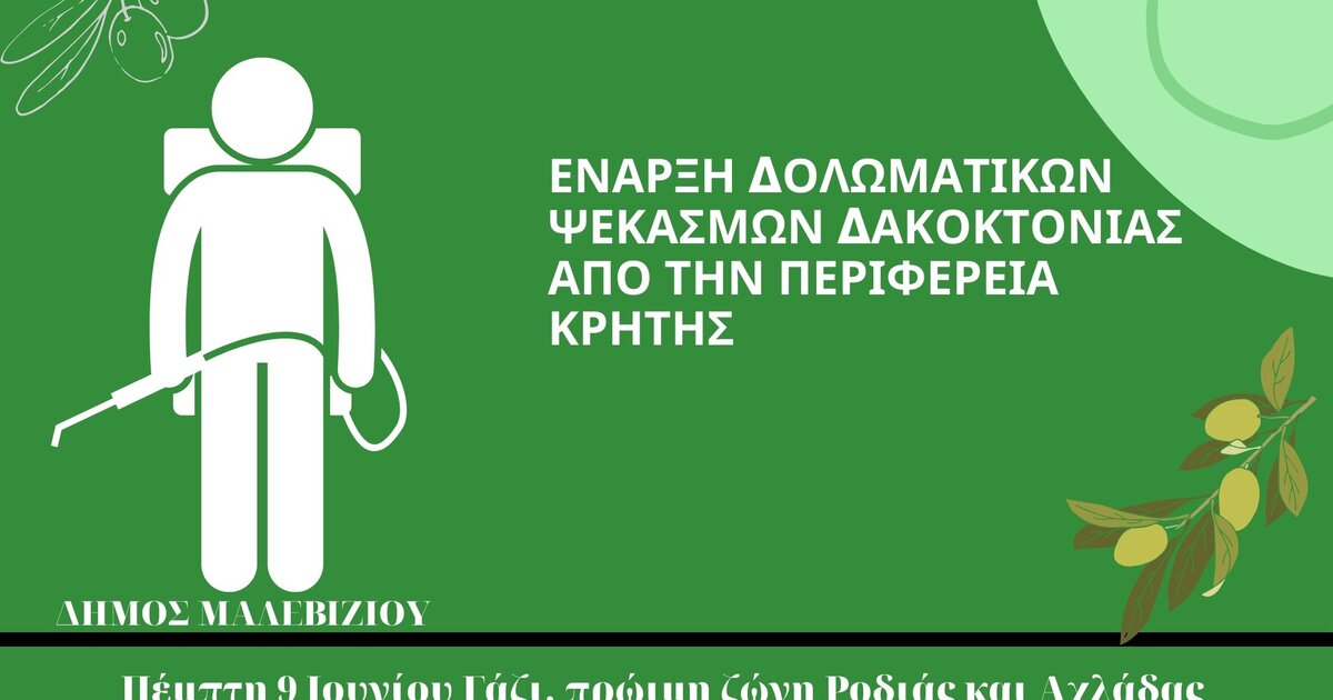 Την ερχόμενη Πέμπτη 9 Ιουνίου ξεκινούν στο Δήμο Μαλεβιζίου οι δολωματικοί ψεκασμοί για την καταπολέμηση του δάκου από τη Διεύθυνση Αγροτικής Ανάπτυξης της Περιφερειακής Ενότητας Ηρακλείου.