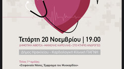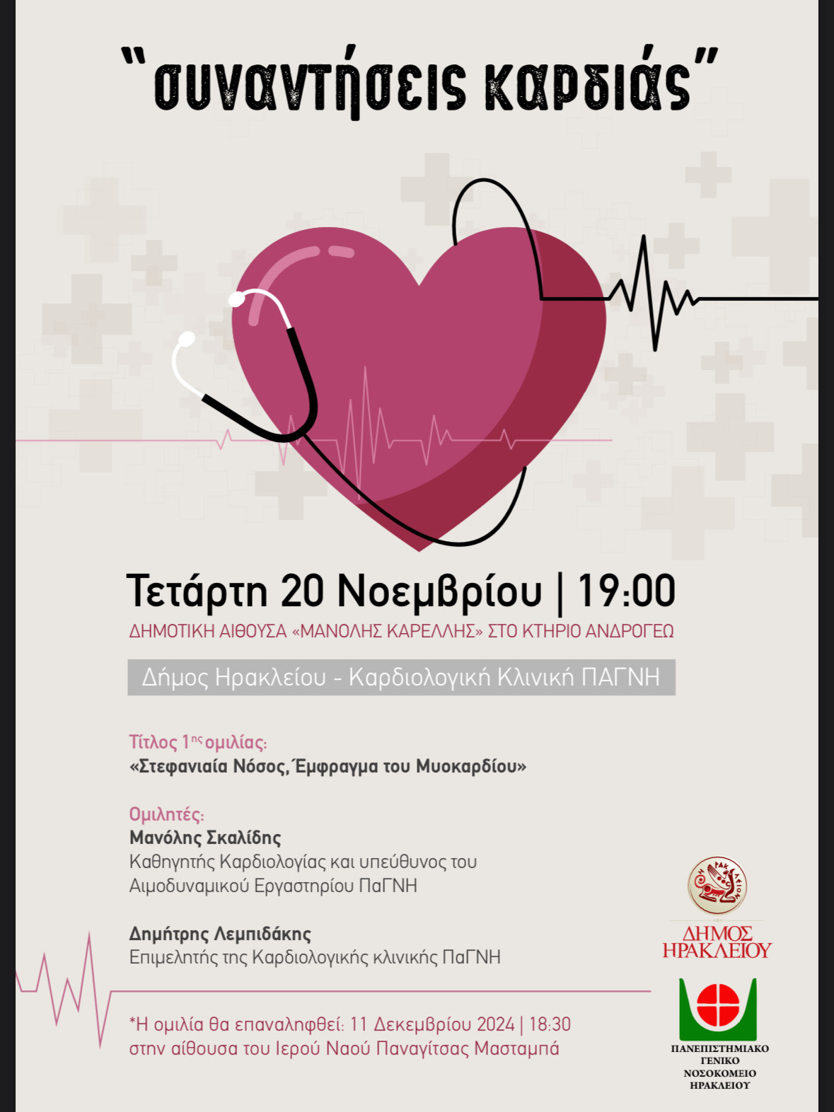 Ένας νέος κύκλος ομιλιών, οι «Συναντήσεις Καρδιάς», με στόχο την πρόληψη και την ενημέρωση του κοινού γύρω από τα καρδιολογικά προβλήματα, ξεκινά από την Καρδιολογική Κλινική του ΠΑΓΝΗ και τον Δήμο Ηρακλείου στις 20 Νοεμβρίου.
