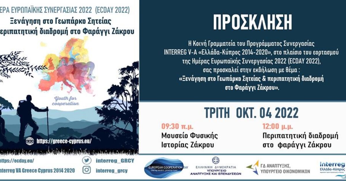 Η Κοινή Γραμματεία του Προγράμματος Συνεργασίας INTERREG V-A «Ελλάδα Κύπρος 2014-2020» υπό την αιγίδα της Ειδικής Γραμματείας Διαχείρισης Τομεακών Ε.Π. του ΕΤΠΑ & ΤΑ, της Γενικής Διεύθυνσης Ανάπτυξης του Υπουργείου Οικονομικών, της Κυπριακής Δημοκρατίας και της Ειδικής Υπηρεσίας Διαχείρισης , στο πλαίσιο του εορτασμού της Ημέρας Ευρωπαϊκής Συνεργασίας 2022 (ECDAY 2022), διοργανώνει εκδήλωση αύριο Τρίτη 4 Οκτωβρίου 2022 από τις 09:30 μέχρι τις 14:00.