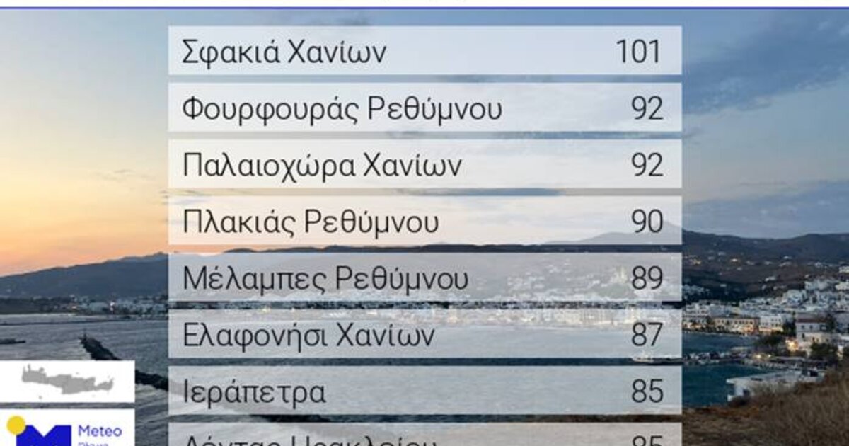 Ισχυροί βόρειοι άνεμοι έπληξαν την Κρήτη την Κυριακή 29 Ιουνίου 2025, με τις ριπές να φτάνουν ακόμη και τα 101 km/h στα Σφακιά Χανίων, σύμφωνα με τα στοιχεία του Εθνικού Αστεροσκοπείου Αθηνών/meteo.gr.