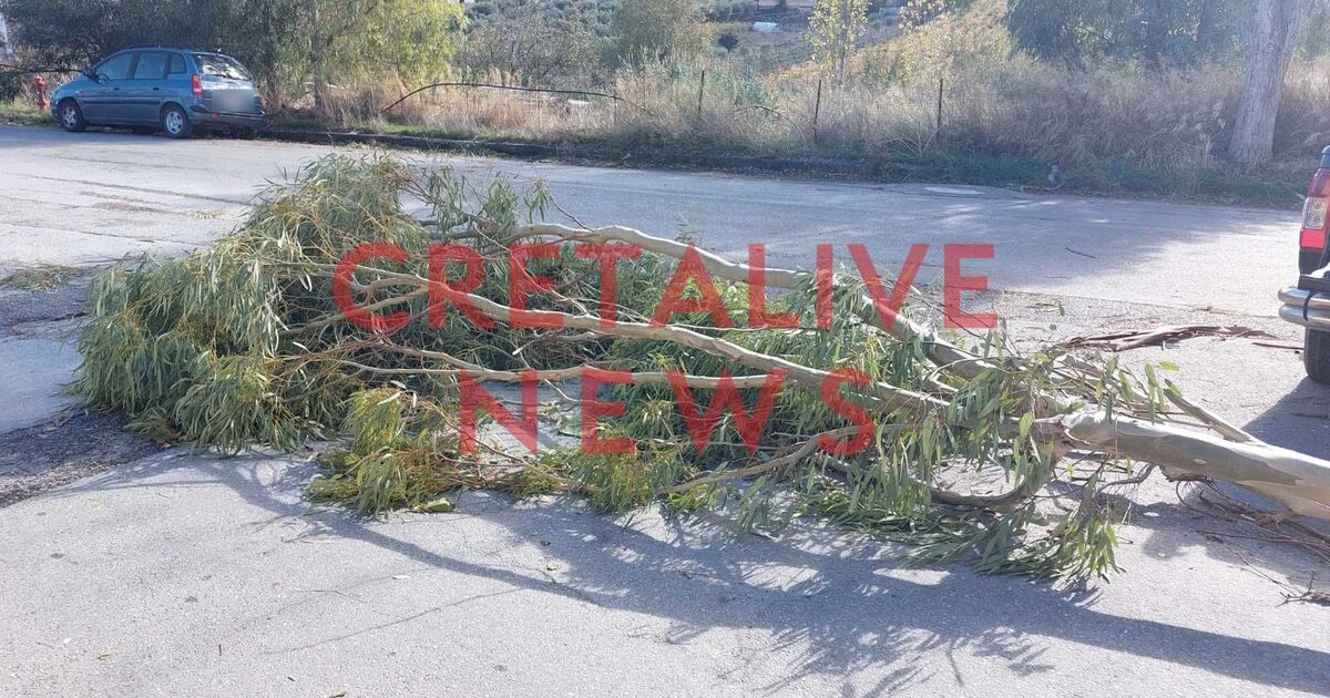 Οι θυελλώδεις άνεμοι που σφυροκοπούσαν ήδη από το Σάββατο την Κρήτη λύγισαν τα κλαδιά ενώ και δύο δέντρα ξεριζώθηκαν και έπεσαν στο δρόμο.