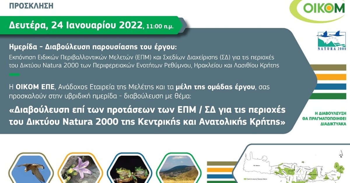 Τη Δευτέρα, 24 Ιανουαρίου 2022, και ώρα 11:00 π.μ., θα πραγματοποιηθεί ημερίδα - διαβούλευση παρουσίασης / ενημέρωσης στο πλαίσιο του έργου «Εκπόνηση Ειδικών Περιβαλλοντικών Μελετών (ΕΠΜ) και Σχεδίων ∆ιαχείρισης (Σ∆) για τις περιοχές του ∆ικτύου Natura 2000 των Περιφερειακών Ενοτήτων Ρεθύμνου, Ηρακλείου και Λασιθίου Κρήτης».