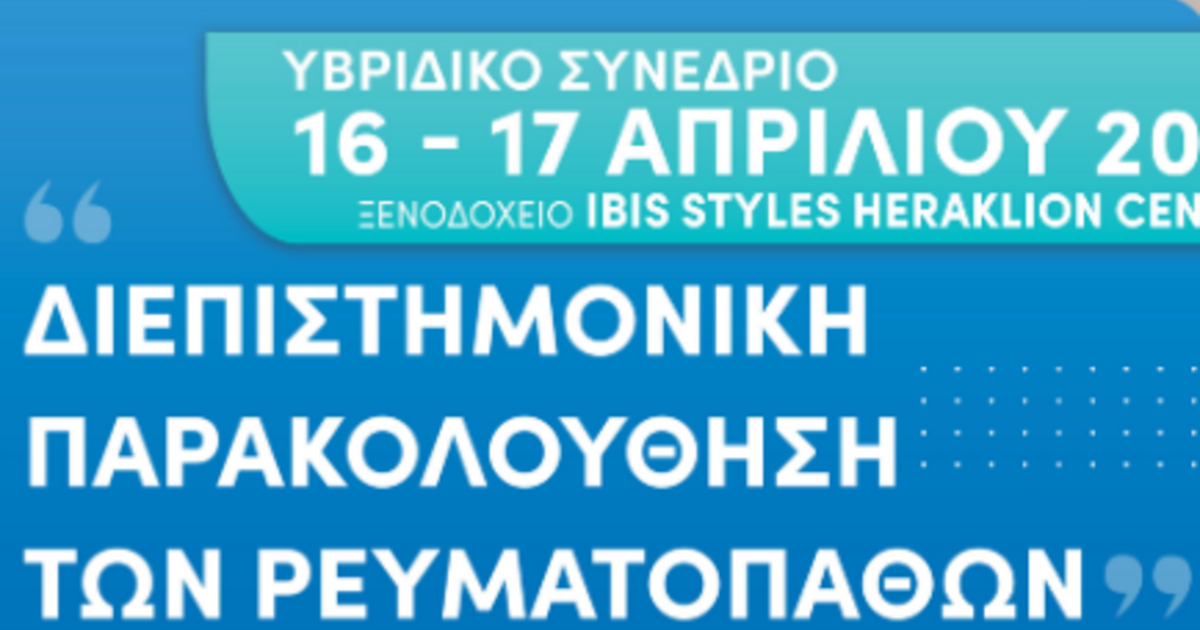 Ο Σύλλογος Ρευματοπαθών Κρήτης, στο πλαίσιο της γενικής ενημέρωσης για τα ρευματικά νοσήματα και της συνεργασία με άλλους συλλόγους ασθενών, και αναγνωρίζοντας την ανάγκη ολιστικής προσέγγισης και αντιμετώπισης των ρευματοπαθών από άλλους επαγγελματίες υγείας πλην του ρευματολόγου, διοργανώνει υβριδικό συνέδριο με τίτλο «Διεπιστημονική παρακολούθηση των ρευματοπαθών – Η αναγκαιότητα φροντίδας των ρευματοπαθών από εξειδικευμένους επαγγελματίες υγείας» στις 16 & 17 Απριλίου 2022, στο ξενοδοχείο Ibis Styles Heraklion Central στο Ηράκλειο.
