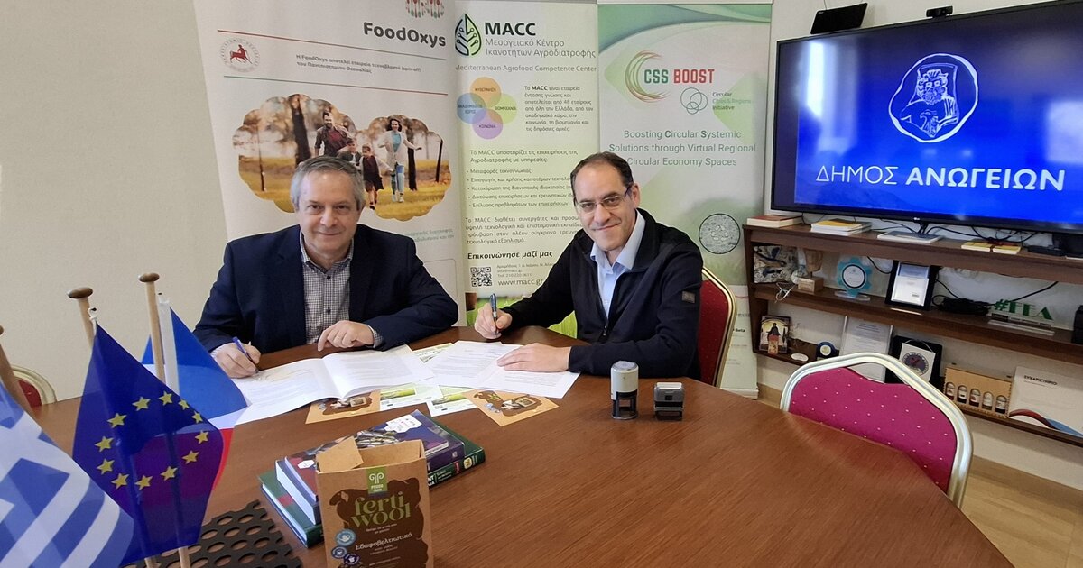 Υπεγράφη σήμερα, 10 Απριλίου 2025, Μνημόνιο Συνεργασίας μεταξύ του Δήμου Ανωγείων και του Μεσογειακού Κέντρου Ικανοτήτων Αγροδιατροφής (Mediterranean Agrifood Competence Center - MACC). Το μνημόνιο υπέγραψαν ο Δήμαρχος Ανωγείων, κ. Σωκράτης Κεφαλογιάννης, και ο Διευθύνων Σύμβουλος του MACC, Δρ. Μιχάλης Καθαράκης, στις εγκαταστάσεις του MACC.