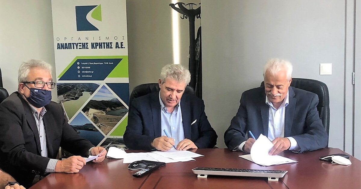 Στην υπογραφή της σύμβασης που αφορά την κατασκευή του έργου για την «Ύδρευση της Αστικής – Τουριστικής Περιοχής από την Γεωργιούπολη έως και τον Καβρό», προχώρησαν την Πέμπτη 28/4/2022 στις εγκαταστάσεις του Οργανισμού Ανάπτυξης Κρήτης στην Αγυιά Χανίων, ο Διευθύνων Σύμβουλος του Ο.Α.Κ. κ. Άρης Παπαδογιάννης, ο Δήμαρχος Αποκορώνου, κ. Χαράλαμπος Κουκιανάκης και ο Εκπρόσωπος της Τεχνικής Εταιρίας [ανάδοχος] ΤΟΞΟ ΑΕΤΕ, κ. Χαράλαμπο Παντελάκη.